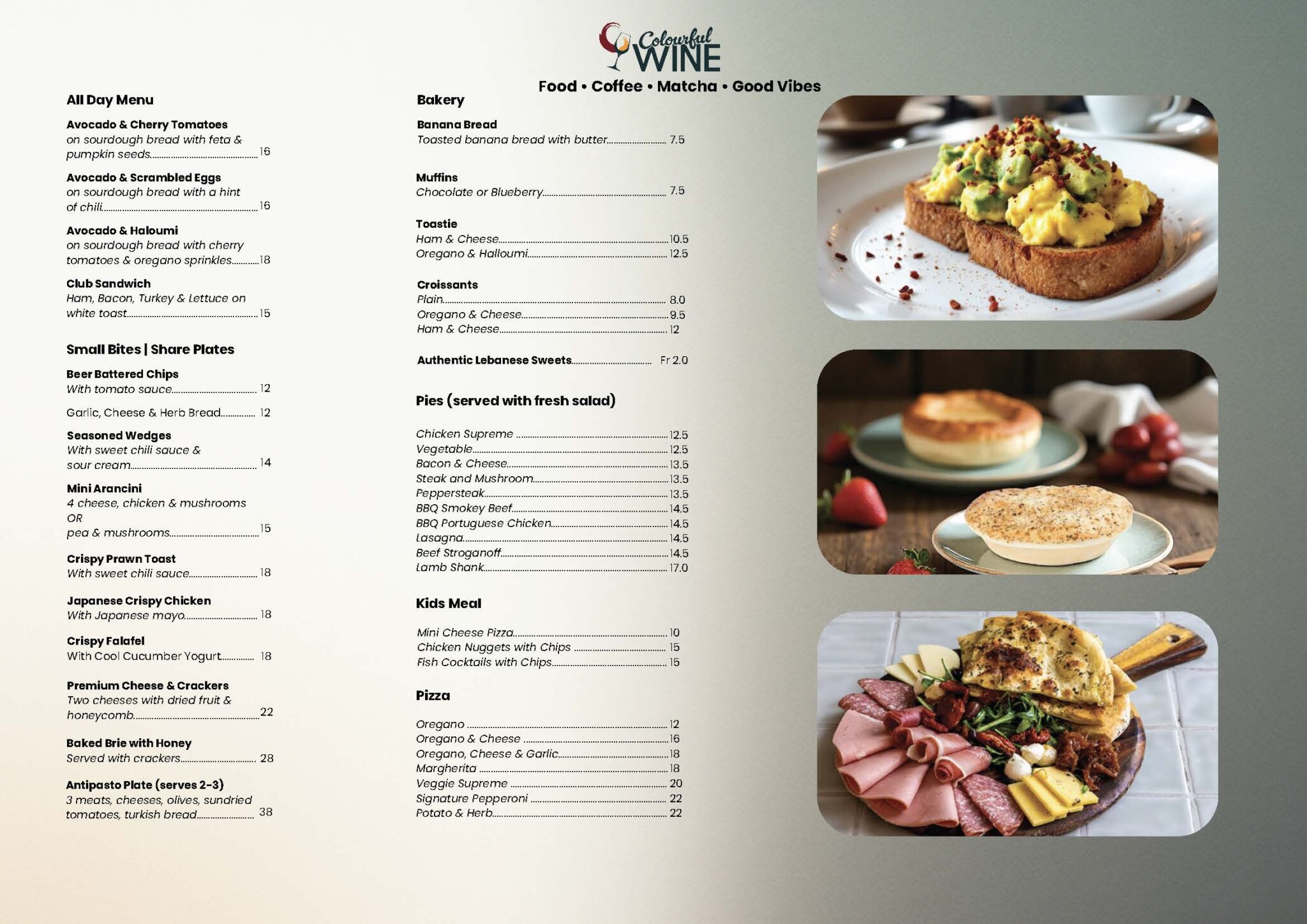 Planning an event? Download our full menu to explore catering-friendly bites, crowd-pleasing share plates, cocktails, mocktails, and brunch favourites perfect for parties, workshops, and celebrations at Colourful Wine. Get inspired and start designing the perfect experience for your group.