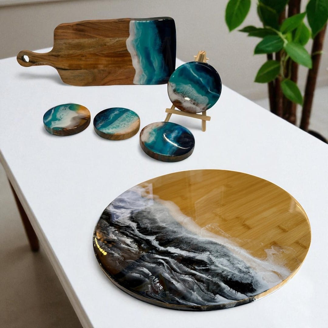 Our most popular creative workshop is resin art — a unique and satisfying process where you design your own piece using flowing colours and glossy finishes.